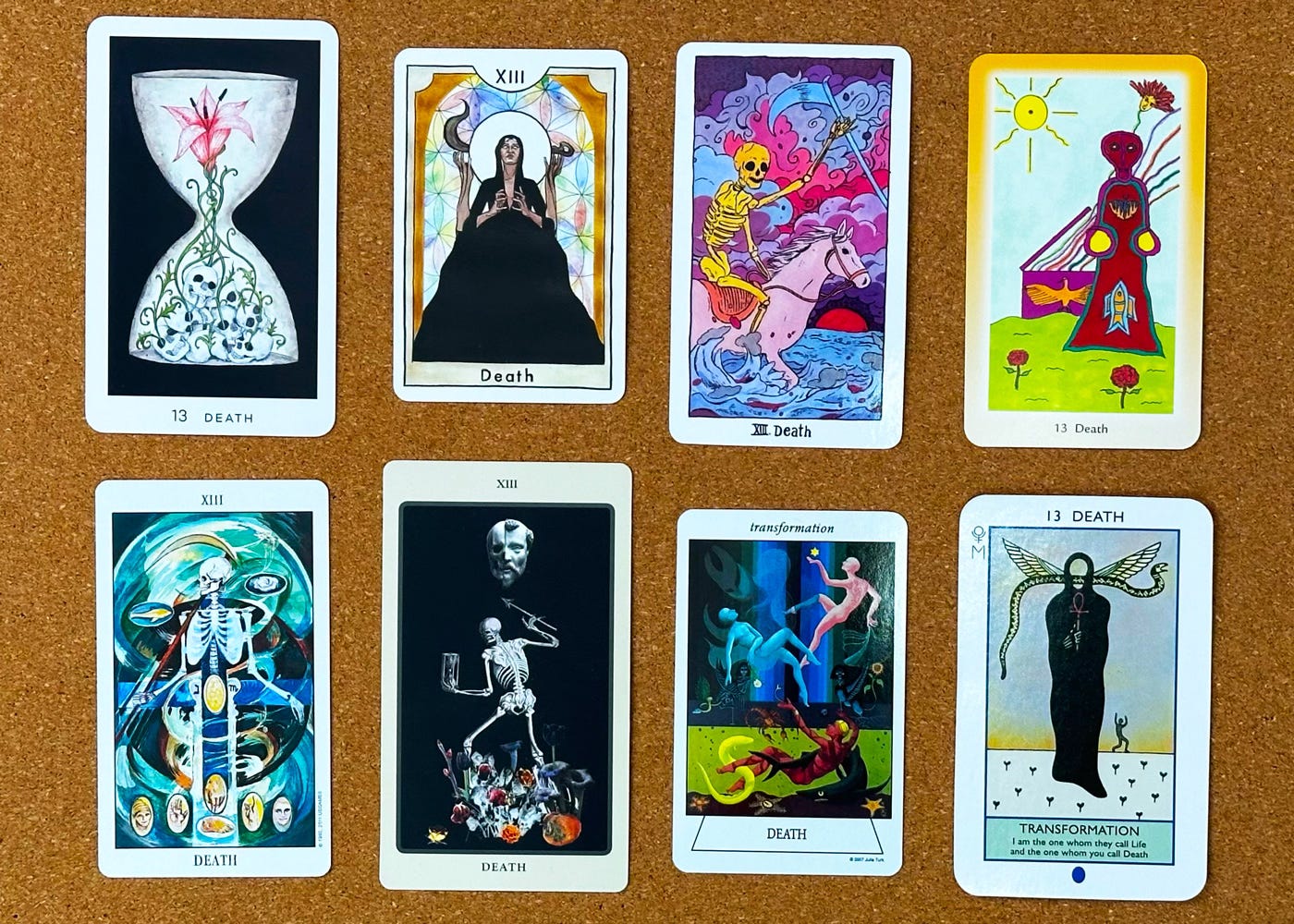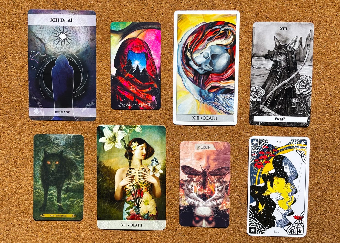 Helenโs cards, clockwise from top left: Moon & Stars Tarot; Light Seerโs Tarot; Japaridze Tarot; Canes Arcanae; Star Spinner Tarot; Muse Tarot; Tarot of Mystical Moments; Forest of Enchantment Tarot.