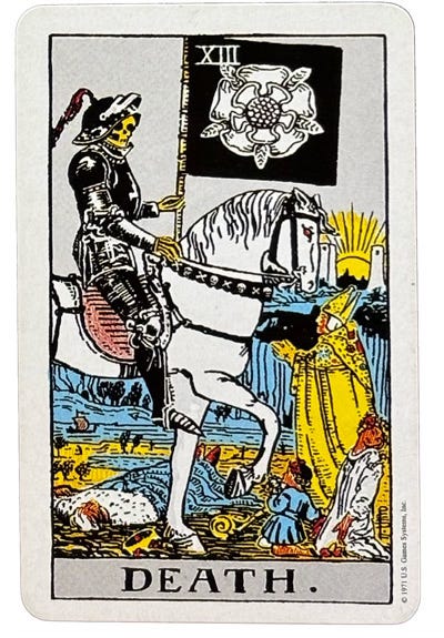 Change, especially that difficult moment when the old thing has passed away and the new thing has yet to emerge. The Death card refers not just to endpoints, but to the evolution points that are through-lines in any life: those times between phases when all is in flux. Such liminal moments are opportunities for meaning-making, as we decide how to interpret them within the larger narratives that are continuing to unfold. Death invites us to recognize and acknowledge changes large and small, scary and joyful, so that we can fully integrate them.
