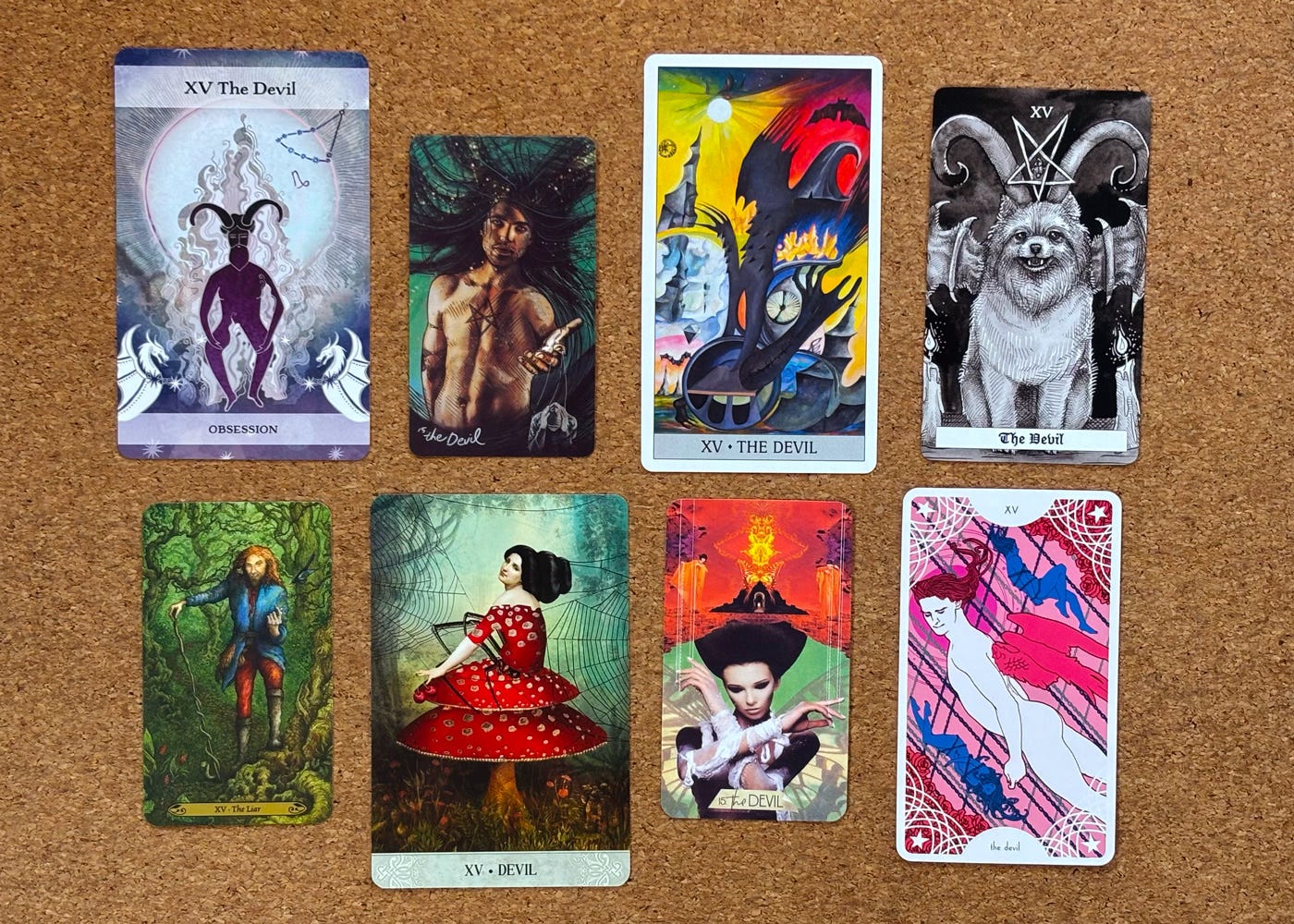 Helen’s cards, clockwise from top left: Moon & Stars Tarot; Light Seer’s Tarot; Japaridze Tarot; Canes Arcanae; Star Spinner Tarot; Muse Tarot; Tarot of Mystical Moments; Forest of Enchantment Tarot.