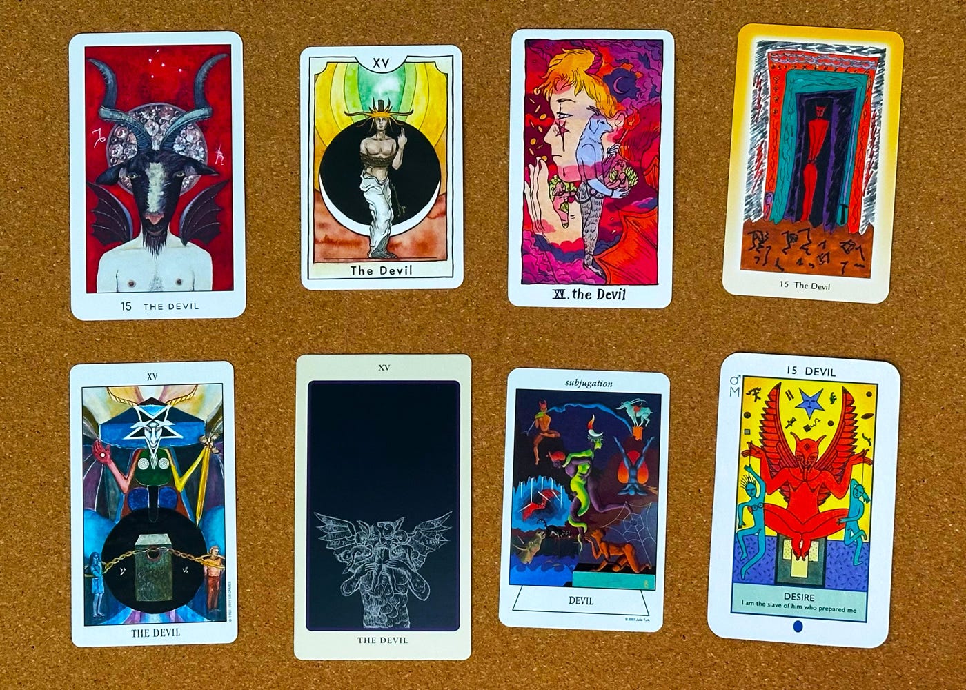 Margy’s cards, clockwise from top left: Radiant Tarot; New Chapter Tarot; Cosmic Slumber Tarot; Shining Tribe Tarot; Elemental Tarot; Navigators Tarot of the Mystic Sea; Spolia Tarot; Tarot of the Spirit.
